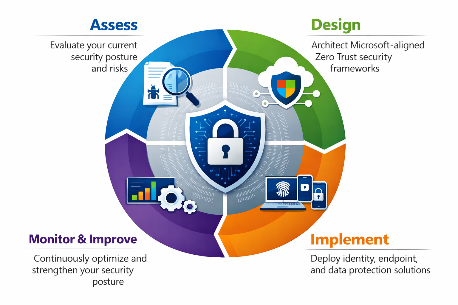 Protect user identities and email communications using Microsoft Entra ID, Conditional Access, and advanced threat protection. - Zero Trust Architecture Implementation